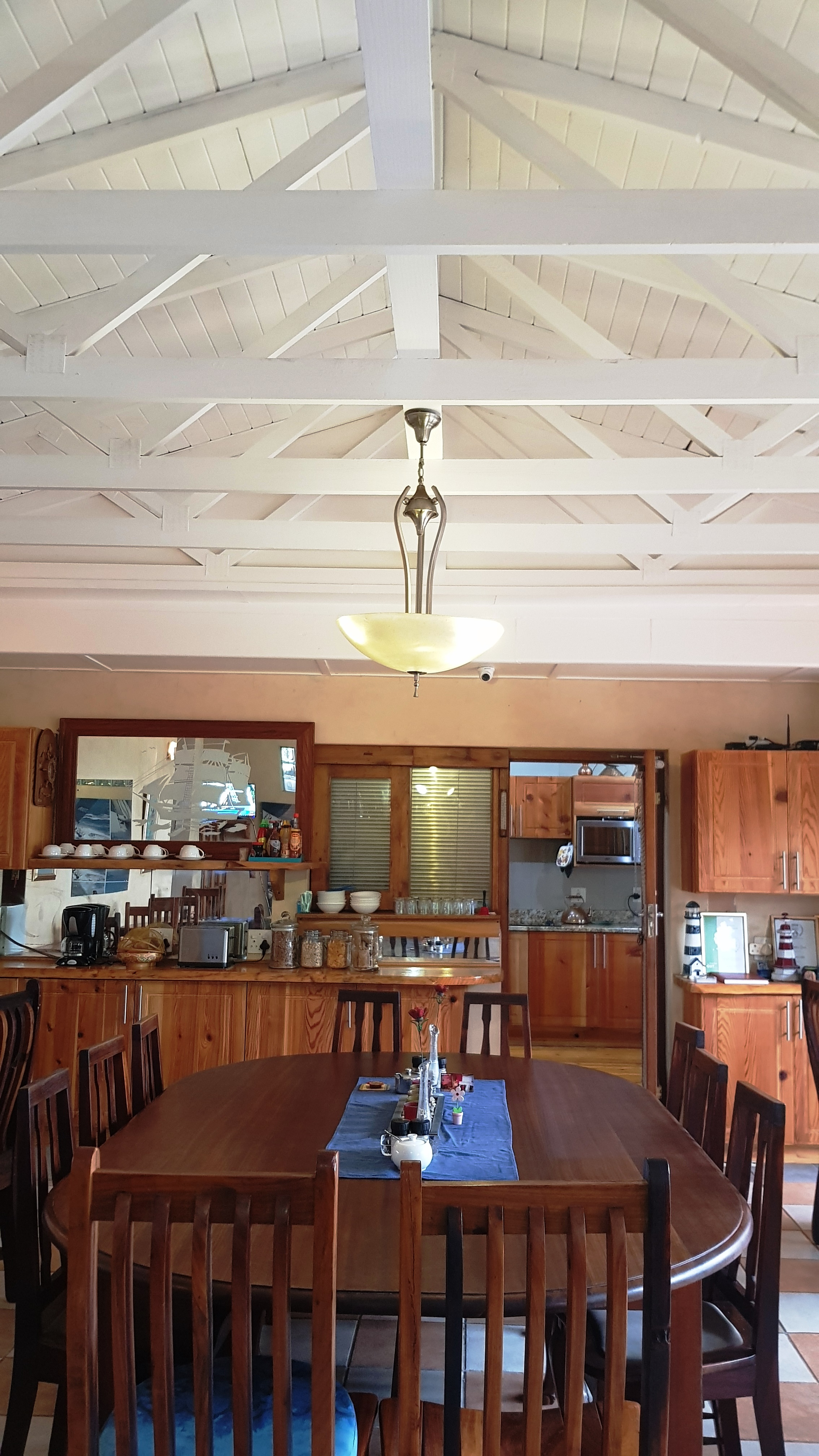 Our Dining room is large enough to seat up to 22 people. One large, central, solid wooden table, seating large groups of 10; surrounded by 4 smaller, sleeper wood tables for groups of 3 or less, are spaciously positioned under a magnificent, open vaulted ceiling.